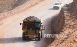 Alat berat mengangkut ore hasil pertambangan di Tambang Emas PT Bumi Suksesindo (BSI) Gunung Tumpang Pitu, Pesanggaran, Banyuwangi, Jawa Timur, Kamis (5/12/2019). (FOTO : Antara/Budi Candra Setya)