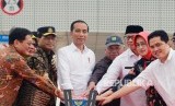 Presiden Joko Widodo (tengah) didampingi Menteri Pekerjaan Umum dan Perumahan Rakyat Basuki Hadimuljono (keempat kanan), Menteri BUMN Erick Tohir (kanan), Menteri Perhubungan Budi Karya Sumadi (Ketiga kiri), Gubernur Banten Wahidin Halim (ketiga kanan), Walikota Tangerang Selatan Airin Rachmy Diani (kedua kanan) dan Direktur Utama Jasa Marga Desi Aryani (kedua kiri) menekan tombol sirine tanda pengoperasian jalan Tol JORR II Ruas Tol Serpong - Kunciran di Gerbang Tol Parigi Bintaro, Tangerang Selatan, Banten, Jumat (6/12/2019). (FOTO : Antara/Muhammad Iqbal)