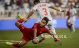 Pemain Timnas Indonesia Asnawi Mangkualam Bahar saat berebut bola dengan pemain Timnas Myanmar Ye Min Thu pada pertandingan semi final sepak bola Sea Games 2019 di Rizal Memorial Stadium, Manila, Filipina, Sabtu (7/12). (FOTO : Republika/Putra M. Akbar)