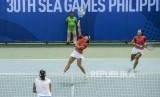 Petenis Indonesia Beatrice Gumulya dan Jessy Priskilia Rompies memukul bola saat melawan petenis Thailand Peangtarn Plipuech dan Tamarine Tanasugarn pada pertandingan final tenis kategori ganda putri di RMSC Tennis Court, Manila, Filipina, Sabtu (7/12). (FOTO : Republika/Putra M. Akbar)