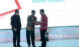 Disaksikan Menteri Hukum dan HAM Yasonna Laoly (kiri), Menteri Koordinator bidang Politik, Hukum dan Keamanan Mahfud MD menyerahkan penghargaan Peduli HAM Tahun 2018 kepada Gubernur Jawa Barat Ridwan Kamil (kanan) pada Peringatan Hari Hak Asasi Manusia (HAM) Sedunia ke-71 Tahun 2019, di Gedung Merdeka, Kota Bandung, Selasa (10/12). (FOTO : Republika/Edi Yusuf)