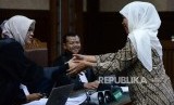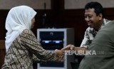 Gubernur Jawa Timur Khofifah Indar Parawansa berjabat tangan dengan terdakwa Romahurmuziy usai memberikan keterangan sebagai saksi di Pengadilan Tipikor, Jakarta, Rabu (11/12). (FOTO : Republika/Prayogi)