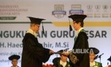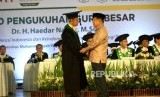 Pengukuhan Guru Besar Haedar Nashir. Prof Haedar Nashir menerima ucapan selamat usai upacara Pengukuhan Guru Besar di Sportorium UMY, Yogyakarta, Kamis (12/12). (FOTO : Republika/ Wihdan)