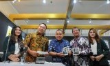 Direktur Konsumer Bank Bukopin Rivan A. Purwantono, Direktur Utama Bank Bukopin Eko Rachmansyah Gindo, Direktur Operasi & Teknologi Informasi Adhi Brahmantya (dari kedua kiri) aat ujicoba layanan //Virtual Interactive Online Assistant// atau Viola di Jakarta, Rabu (12/12). (FOTO : Tahta Aidilla/Republika)