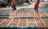 Pekerja menjemur terasi (bumbu masak dari fermentasi udang rebon) di sentra produksi terasi Kampung Bahari Tambaklorok, Semarang, Jawa Tengah, Kamis (12/12/2019). (FOTO : AJI STYAWAN/ANTARA FOTO)