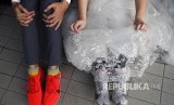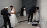 Pasangan calon pengantin mengenakan sepatu lari saat bersiap untuk mengikuti lomba lari Running of The Brides yang diikuti oleh ratusan pasang calon pengantin di Bangkok, Thailand beberapa waktu lalu. Lomba ini memperebutkan hadiah paket pernikahan hingga cincin berlian. (FOTO : Rungroj Yongrit/EPA EFE)