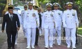Dubes Indonesia untuk Timor Leste Sahat Sitorus (kiri) bersama Kapushidrosal Laksda TNI Harjo Susmoro (kedua kiri), Danguspurla Koarmada III TNI AL Laksma TNI Rudhi Aviantara (kanan), Komandan KRI Usman Harun sekaligus Dansatgas Indonesia Maritime Envoy-19B Kolonel Laut (P) Himawan (ketiga kanan) serta Komandan KRI Sultan Iskandar Muda Letkol Laut (P) Rasyid (kedua kanan) berjalan memasuki Taman Makam Pahlawan Seroja untuk melaksanakan upacara ziarah, DIli, Timor Leste, Jumat (13/12/2019). (FOTO : Antara/Zabur Karuru)