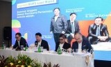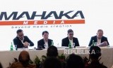 Komisaris Utama PT Mahaka Media Tbk yang baru R. Harry Zulnardy (kiri), Komisaris Independen Harry Danui (kedua kiri), Direktur Utama Adrian Syarkawie (kedua kanan) Direktur Troy Reza Warokka (kanan) memimpin Rapat Umum Pemegang Saham (RUPS) Mahaka di Jakarta, (13/12). (FOTO : Thoudy Badai_Republika)