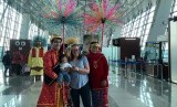 Wisatawan mancanegara berfoto dengan model berpakaian tradisional Bali di Terminal Bandara Internasional Ngurah Rai, Denpasar, Bali. (FOTO : Istimewa)
