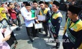 Wakil Gubernur Jawa Barat, Uu Ruzhanul Ulum bersama sejumlah pejabat terkait secara simbolis menyerahkan hadiah Juara OPOP tingkat kabupaten/kota saat pembukaan Gelar Produk One Pesantren One Product (OPOP), di halaman Gedung Sate, Kota Bandung, Sabtu (14/12). (FOTO : Republika/Edi Yusuf)