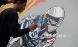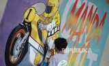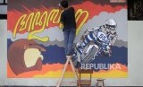 Mural Menuju Moto GP Mandalika. Seniman menggambar mural di Yogyakarta, Ahad (15/12). (FOTO : Republika/ Wihdan)