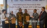 Direktur Utama PT Repower Asia Indonesia Aulia Firdaus (kedua kanan) bersama Direktur PT Repower Asia Indonesia Rully Muliarto (kanan), GM Consumer Financing Division BNI Syariah M. Samson (ketiga kanan), Head Area Bank Mandiri Fatmawati Rachman Budi Susanto (ketiga kiri), Vice President Non Subsidized Mortgage & Personal Lending Division Bank BTN Suhartini (kedua kiri) dan Branch Manager Bank Panin KC Bogor Hadijanto Husen (Kiri) berbincang usai tanda tangan MoU di Jakarta, Senin (16/12). (FOTO : Republika/Putra M. Akbar)