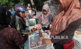 Warga antre membeli telur ayam saat operasi pasar murni yang diselenggarakan Dinas Perindustrian dan Perdagangan di Taman Skartaji, Kota Kediri, Jawa Timur, Senin (16/12/2019). (FOTO : Prasetia Fauzani/ANTARA FOTO)