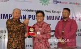 Direktur Utama Mandiri Syariah Toni EB Subari (kanan) memberikan cinderamata kepada Ketua PP Muhammadiyah Anwar Abas (kiri) usai penandatanganan kerjasama di Gedung Pusat Dakwah Muhammadiyah, Jakarta, Senin (16/12). (FOTO : Republika/Prayogi)