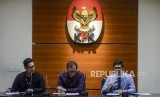 Wakil Ketua KPK Saut Situmorang dan Laode M. Syarif bersama Juru Bicara KPK Febri Diansyah memberikan keterangan saat konferensi pers di Gedung KPK, Jakarta, Senin (16/12). (FOTO : Republika/Putra M. Akbar)