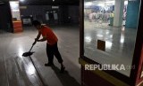 Petugas membersihkan tempat relokasi pedagang kaki lima (PKL) Pasar Senen di lantai empat Pasar Metro Atom, Pasar Baru, Jakarta, Selasa (17/12/2019). (FOTO : Antara/Aditya Pradana Putra)