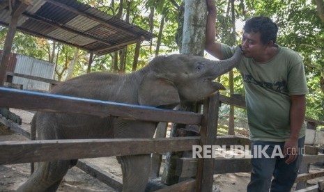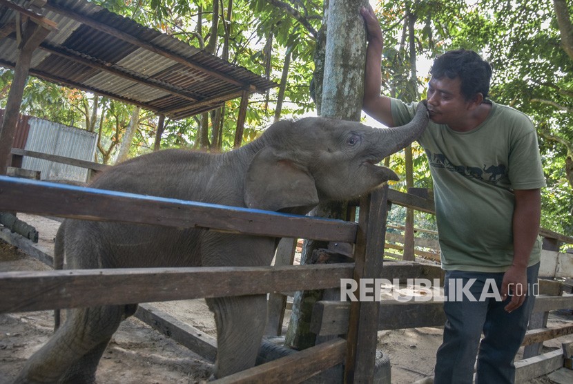 Seekor bayi gajah sumatra (Elephas maximus sumatrensis) berusia tiga bulan dengan luka di kaki kiri akibat jerat, membelai wajah pawang dengan belalainya di kandang perawatan Pusat Latihan Gajah Minas, Provinsi Riau, Selasa (17/12/2019). (FOTO : Antara/FB Anggoro)