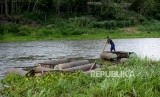 Pencari Pasir Tradisional. Perahu digunakan warga untuk mencari pasir secara tradisional di Sungai Opak, Pundong, Bantul, Yogyakarta, Rabu (18/12). (FOTO : Republika/ Wihdan)