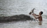 Pencari Pasir Tradisional. Warga mencari pasir secara tradisional di Sungai Opak, Pundong, Bantul, Yogyakarta, Rabu (18/12). (FOTO : Republika/ Wihdan)