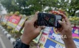 Warga memotret karangan bunga yang terpajang di depan Gedung KPK, Jakarta, Jumat (20/12). (FOTO : Republika/Putra M. Akbar)