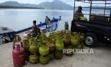 Buruh melakukan aktivitas bongkar muat tabung gas elpiji untuk kebutuhan warga pulau di TPI Pelabuhan Ulee Lheue, Banda Aceh, Jumat (20/12/2019). (FOTO : AMPELSA/ANTARA FOTO)
