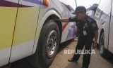 Petugas Dinas Perhubungan Kota Depok memeriksa kondisi ban bus saat pemeriksaan kelayakan kendaraan (ramp check) di Terminal Jatijajar, Depok, Jawa Barat, Jumat (20/12/2019). (FOTO : ASPRILLA DWI ADHA/ANTARA FOTO)