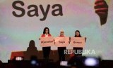 Direktur Utama Pertamina Nicke Widyawati (tengah), Direktur Bank Mandiri Alexandra Askandar (kiri) dan Direktur PGN Desima E Siahaan (kanan) menunjukan kampanye #gerakansayaberani pada perigatan Hari Ibu Kerja Profesional tanpa Pelecehan Seksual di Jakarta, Ahad (22/12). (FOTO : Prayogi/Republika)