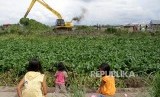 Pekerja menggunakan alat berat membersihkan tanaman eceng gondok yang menutupi permukaan sungai di Makassar, Sulawesi Selatan, Senin (23/12/2019). (FOTO : ARNAS PADDA/ANTARA FOTO)