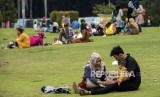 Sejumlah pengunjung duduk diatas rumput saat berwisata di Monumen Nasional (Monas), Jakarta, Rabu (25/12). (FOTO : Republika/Putra M. Akbar)