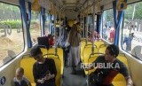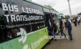 Sejumlah pengunjung saat menaiki bus listrik Transjakarta di Monumen Nasional (Monas), Jakarta, Rabu (25/12). (FOTO : Republika/Putra M. Akbar)