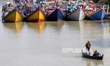 Warga berada di atas perahu dengan latar belakang kapal dan perahu nelayan yang ditambatkan di Daerah Aliran Sungai (DAS) Krueng Aceh, Peunayong, Banda Aceh, Aceh, Rabu (25/12/2019). (FOTO : IRWANSYAH PUTRA/ANTARA FOTO)