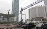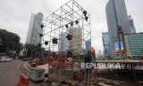 Pekerja mengerjakan instalasi panggung di kawasan Bundaran HI, Jakarta, Rabu (25/12/2019). (FOTO : Antara/Reno Esnir)