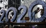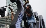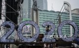 Pekerja menyelesaikan pembuatan instalasi angka 2020 di kawasan Bundaran Hotel Indonesia, Jakarta, Ahad (29/12). (FOTO : Thoudy Badai_Republika)
