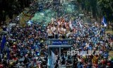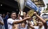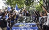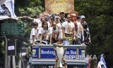 Ribuan bobotoh mengawal arak-arakan Tim Persib Putri keliling Kota Bandung, Jawa Barat, Ahad (29/12/2019). (FOTO : Antara/Raisan Al Farisi)