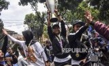 Sejumlah pemain Persib Putri mengangkat piala di Graha Persib, Jalan Sulanjana, Kota Bandung, Ahad (29/12). (FOTO : Abdan Syakura)