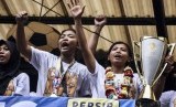 Rombongan tim Persib Putri bersama bobotoh melakukan pawai di ruas Jalan Sulanjana, Kota Bandung, Ahad (29/12). (FOTO : Abdan Syakura)