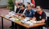 Wakil Direktur Reserse Narkoba AKBP Sapta Maulana (tengah) Kepala Bidang Humas Polda Metro Jaya Kombes Yusri Yunus (kanan) menyampaikan keterangan pers terkait ungkap kasus narkoba di Polda Metro Jaya, Jakarta, Ahad (29/12). (FOTO : Thoudy Badai_Republika)