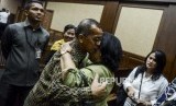 Mantan Direktur Utama Utama PT Garuda Indonesia (Persero) Tbk, Emirsyah Satar (kedua kiri) berpelukan dengan kerabatnya usai menjalani sidang di Pengadilan Tipikor, Jakarta, Senin (30/12). (FOTO : Republika/Putra M. Akbar)