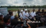 Presiden Joko Widodo (tengah) bersama Menteri PUPR Basuki Hadimuljono (kiri) dan Gubernur DIY Sri Sultan HB X (ketiga kanan) menjawab pertanyaan wartawan saat meresmikan Bendung Kamijoro, Kulonprogo, D.I Yogyakarta, Selasa (31/12/2019) (FOTO : Antara/Andreas Fitri Atmoko)