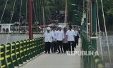 Presiden Joko Widodo (tengah) bersama Menteri PUPR Basuki Hadimuljono (kiri) dan Gubernur DIY Sri Sultan HB X (kanan) melintasi Jembatan Bendung Kamijoro saat peresmian di Kulonprogo, D.I Yogyakarta, Selasa (31/12/2019). (FOTO : Antara/Andreas Fitri Atmoko)