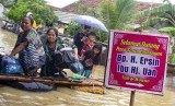 Warga mengevakuasi keluarganya mengunakan perahu rakit saat banjir di Desa karangligar, Karawang, Jawa Barat, Rabu (1/1/2020). (FOTO : Antara/M Ibnu Chazar)