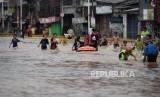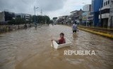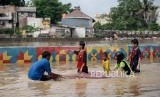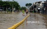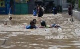 Anak-anak bermain saat banjir di Jalan Jatinegara Barat, Kampung Pulo, Jakarta, Kamis (2/1). (FOTO : Republika/Prayogi)