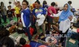 Anggota DPR RI Eko Patrio bermain dengan anak-anak korban banjir di Kelurahan Bidara Cina, Jatinegara, Jakarta, Jumat (3/1). (FOTO : Republika/Putra M. Akbar)