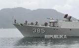 KRI Teuku Umar-385 melakukan peran muka belakang usai mengikuti upacara Operasi Siaga Tempur Laut Natuna 2020 di Pelabuhan Pangkalan TNI AL Ranai, Natuna, Kepulauan Riau, Jumat (3/1/2020). (FOTO : M RISYAL HIDAYAT/ANTARA FOTO)