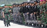Panglima Komando Gabungan Wilayah Pertahanan (Pangkogabwilhan) I Laksdya TNI Yudo Margono (kedua kiri) memeriksa pasukan saat memimpin upacara Operasi Siaga Tempur Laut Natuna 2020 di Pelabuhan Pangkalan TNI AL Ranai, Natuna, Kepulauan Riau, Jumat (3/1/2020). (FOTO : M RISYAL HIDAYAT/ANTARA FOTO)
