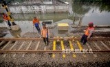 Pekerja memperbaiki rel pascabanjir di kawasan Stasiun Rawa Buaya, Jakarta, Jumat (3/1/2020). (FOTO : FAUZAN/ANTARA FOTO)