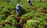 Buruh tani memanen bunga pacar air di areal persawahan Desa Dukuhklopo, Kecamatan Peterongan, Kabupaten Jombang, Jawa Timur, Jumat (3/1/2019). (FOTO : SYAIFUL ARIF/ANTARA FOTO)