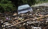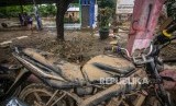 Sebuah mobil terjebak di antara puing-puing bangunan dan sampah akibat terseret arus banjir di Komplek Perumahan Cimareme Indah, Desa Cimareme, Kecamatan Ngamprah, Kabupaten Bandung Barat, Rabu (1/1). (FOTO : Abdan Syakura)