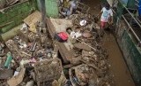 Warga membersihkan sampah pascabanjir yang melanda kawasan Kampung Pulo, Jakarta, Jumat (3/1/2020). (FOTO : Antara/Dhemas Reviyanto)