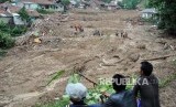 Warga menyaksikan proses pencarian korban tanah longsor di Kampung Sinar Harapan, Desa Harkat Jaya, Kecamatan Sukajaya, Kabupaten Bogor, Jawa Barat, Minggu (5/1/2020). (FOTO : Arif Firmansyah/ANTARA FOTO)